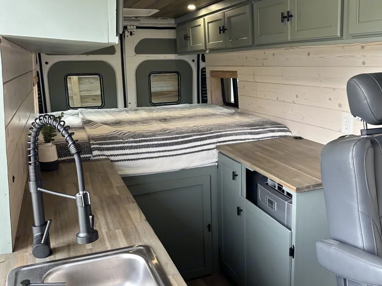 Enjoy this custom built campervan! This van features a short queen size bed, running water, and shore power hookup. Go off grid with 300watts of solar and 400amp hr battery. Van is equipped with an ac/ heater for use with shore power. Shower head in the rear for rinsing off. What's includedRental will include: