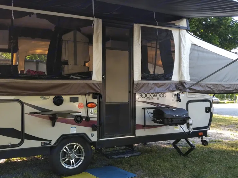 Looking for something easy to tow but with all the features of bigger campers? A beautifully maintained 2017 Rockwood Premier, this is a premium trailer that can keep you comfortable and having fun anywhere you can tow it safely. Bring a generator and you can stay comfortably anywhere you are allowed to camp, even in the back woods. With a 26 gallon water tank and hot and cold running water you can shower and cook anywhere. The additional refrigerator on the outside works off of 110V electricity but the main refrigerator can run off of 110V electricity, propane or battery. Roof racks allow you to carry light weight items like a small boat or a bicycle. One bike rack is available if necessary or bolt on your own. There is an external propane attachment for standard RV barbeque connections. A portable barbeque is available if desired. We pulled it with a Chevrolet Traverse and it is easy to pull. Queen and King sized beds have controllable heated mattresses to help the furnace take the chill out of your night. The slide out adds a lot of extra space for your dining room table and converts to a third bed.. Lots of storage in this unit as well. I have used it in all weather and been comfortable even in early April. Unit opens using a convenient electric winch. Length is listed in the open position so you know how big your campsite needs to be. No Smoking in the trailer please! Toilet is a port-a-potty and needs to be manually emptied.An electric winch makes set up a breeze.