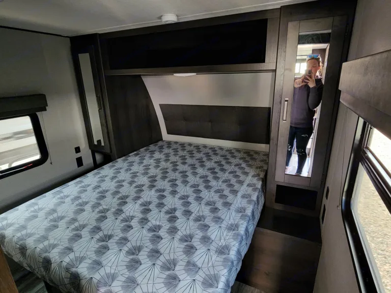 Explore this RV rental bedroom: a comfortable bed, mirrored closet, window, and overhead storage create a cozy travel space.. Grand Design Transcend Xplor 2022