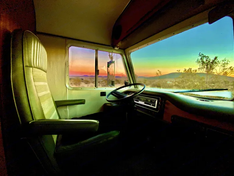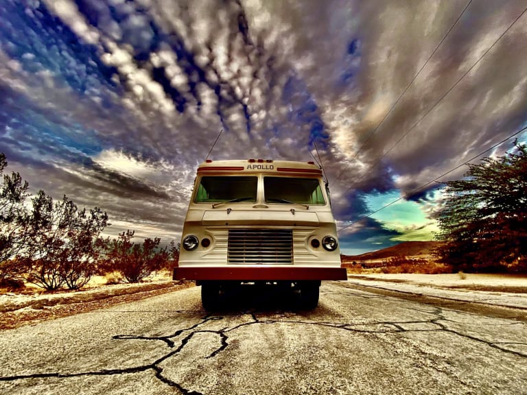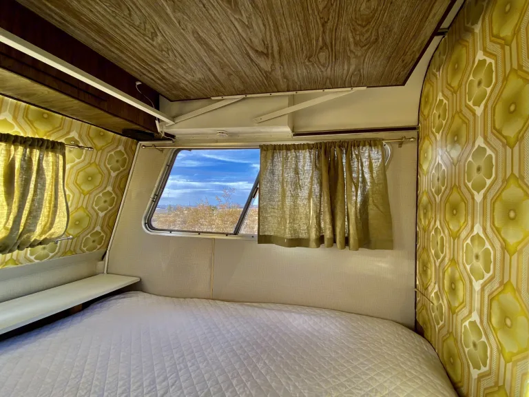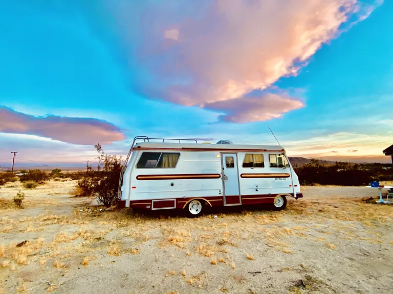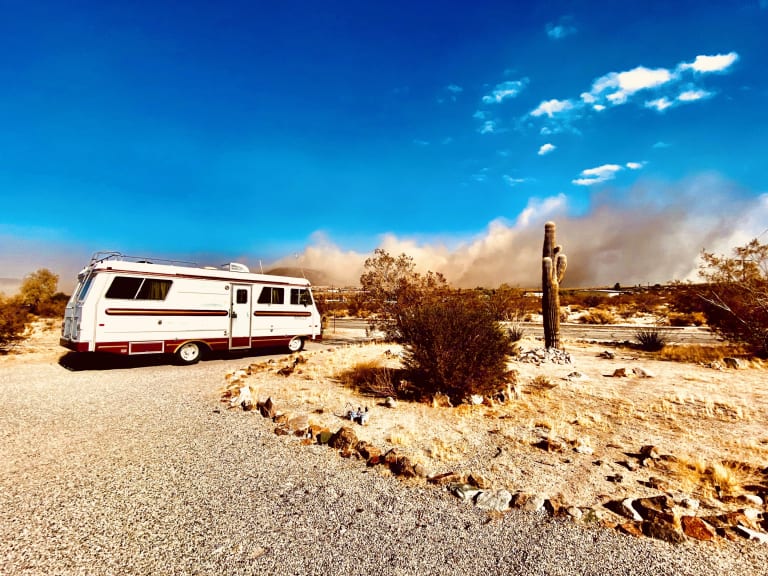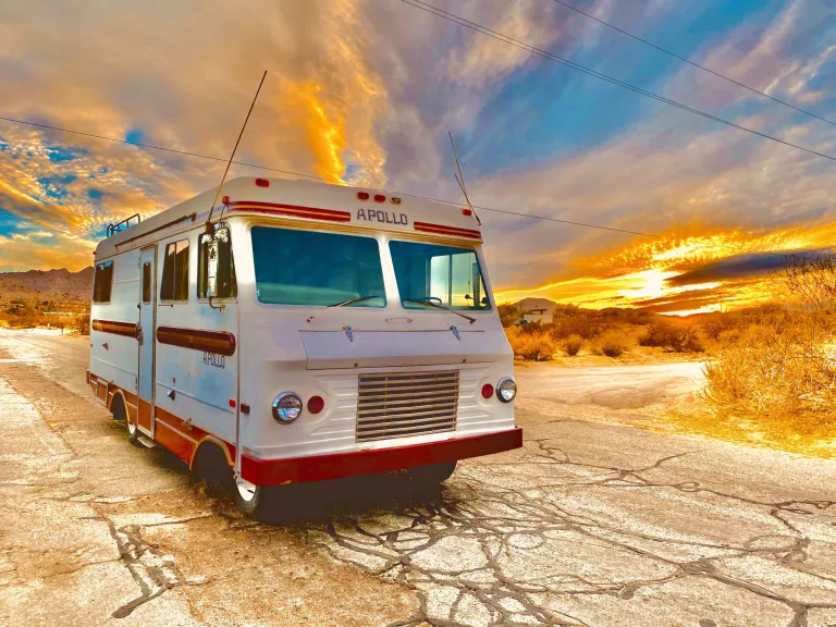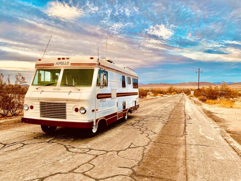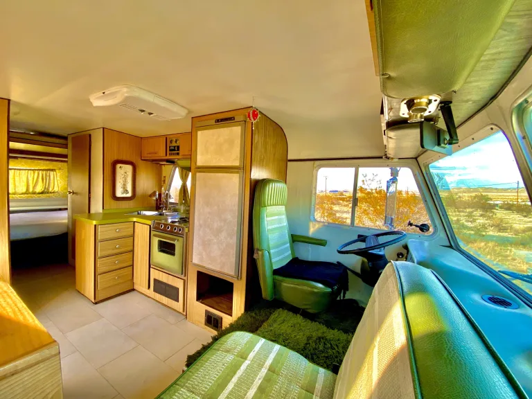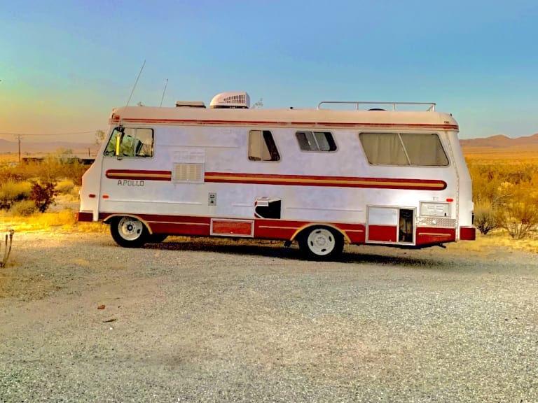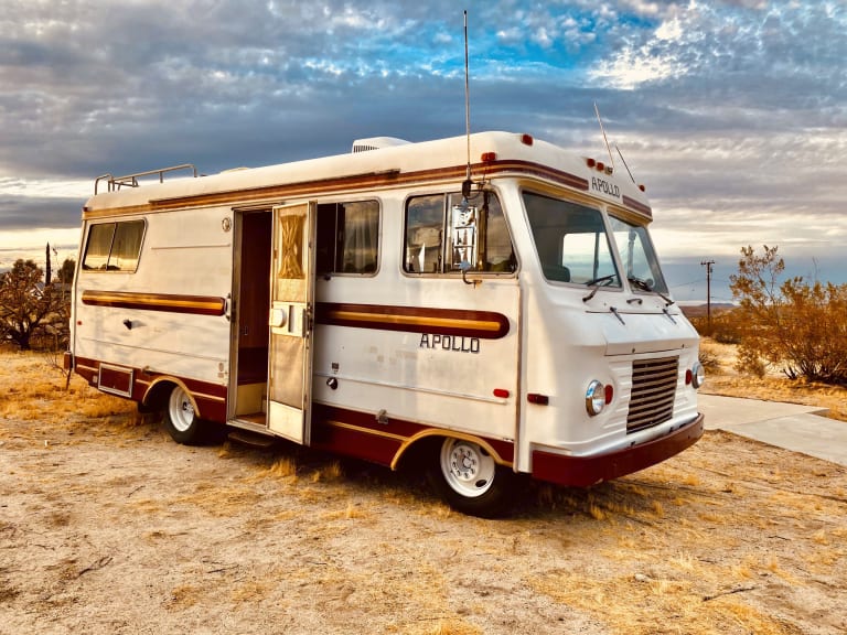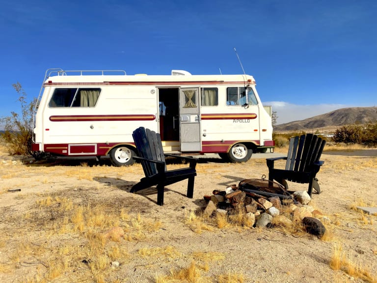 The Motorhome is 46 year old and we suggest to enjoy the confort either on our property in Joshua Tree or safely delivered at a campsite in the National Park or at somebody property for a weekend of nostalgic retro motorhome experience