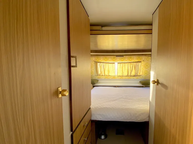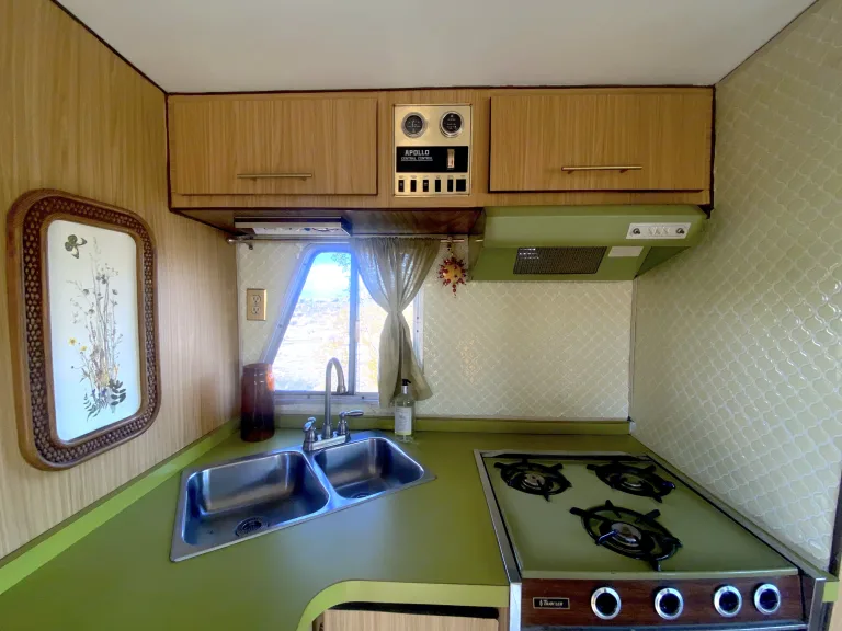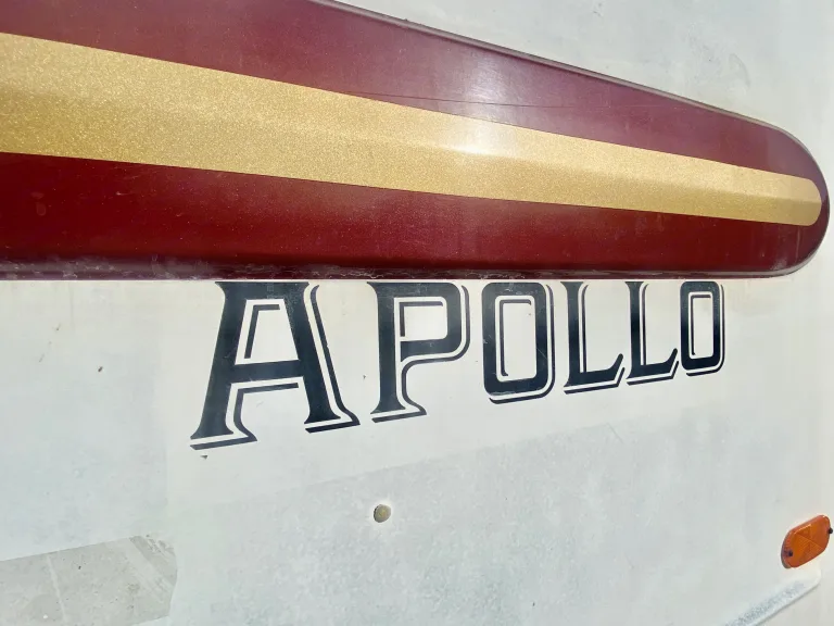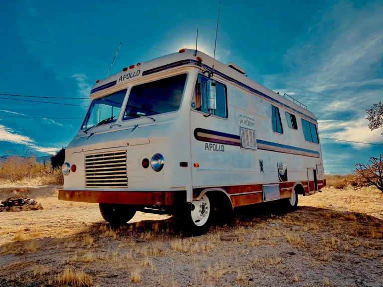 Very well preserved and beautifully aged 1974 Apollo Motorhome featuring one bedroom with 3 panoramic windows, one bathroom cabin with toilet, sink and vanity plus a separate shower cabin with hot and cold water.