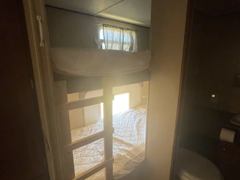 -queen bed and bunks are made ready with fresh linens