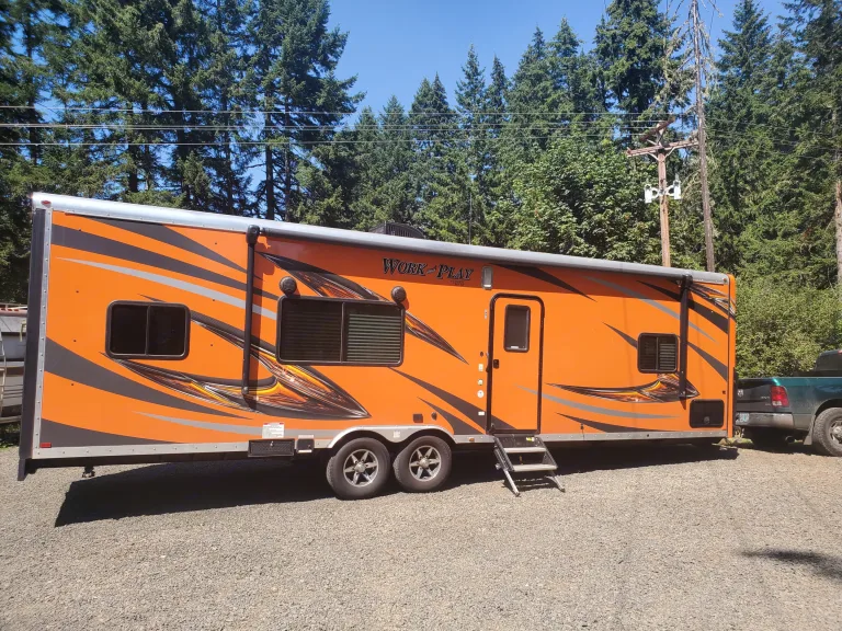 Nice toy hauler with roughly 12" of cargo space 100 gallons of fresh water, onboard generator awning, outdoor and indoor speakers. Has roughly 5k cargo capacity. Heated tanks all the amenities to make your outdoor time feel like home. What's includedI will include the hitch and weight distribution bars. Also leveling blocks and a black water tank solution, as well as toilet paper. There is an assortment of cooking items and a coffee pot. There are also some DVD movies. RecommendationsWe mainly go to the dunes and ride, but have taken it up and down the Oregon Coast and to Central Oregon.Other things to noteno smoking, no drugs, treat it like you are making the payment. Clean up after your self. Our family uses this as well and we want you to enjoy it please be be respectful and have fun. Also no sand camping and please stay on well maintained gravel roads and designated camping sites. Also has 35 gallon onboard fueling station. Please empty all tanks before you return it otherwise a 100 dollar charge will be added. Please refill propane tank before you return trailer or a 50 dollar charge will occur.