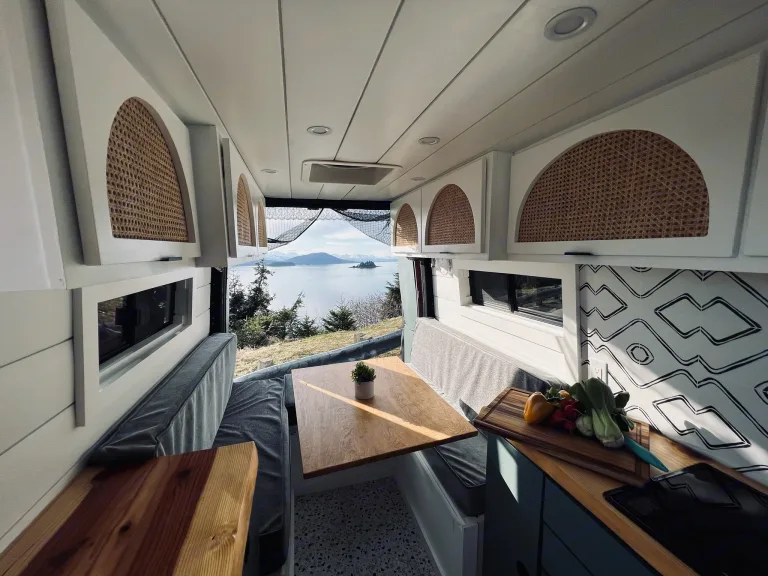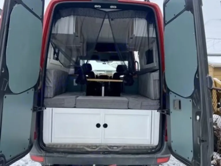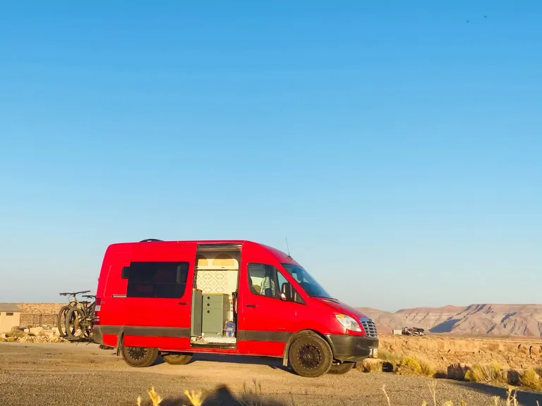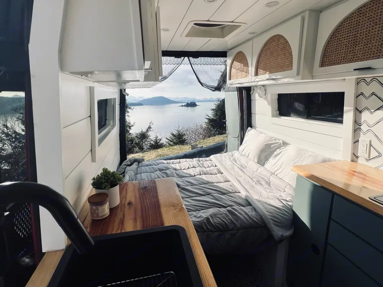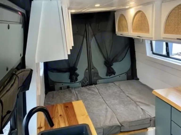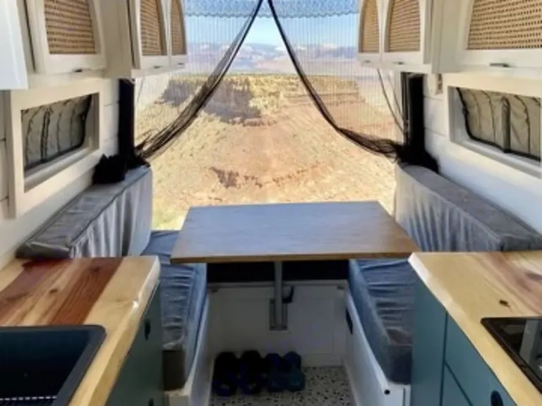 The back doors open wide to give a magical view from bed. Easy to park anywhere. Solar panel help a big deal specially if one needs to turn on heat no need to keep engine running. Overall an awesome experience