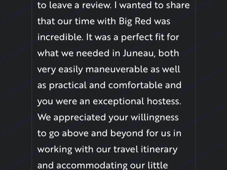 Roadside Assistance Kit*Tent and addtional camping gear available upon requestRecommendationsThere is so much to do in Juneau and the best part of renting the van is you have the wilderness right out your door. We will give you all of our local tips on where to hike, eat and park for the night. There are various campgrounds that you can camp at or use their facilities, we can help with any questions. This capital city is surronded by mountains, glaciers, rivers, forests and ocean. This will be your ultimate Alaskan adventure. We also would love to help book any tours you might have interest in. Whale watching, glacier hikes and float planes are just to name a few of the many amazing adventures you can experience here in Juneau. Other things to note**Drivers are to be verified by Outdoorsy 24-72 hours after booking per insuance reqirements. If not, reservation is subject to cancellation.We will meet you to go over everything in the van so you will feel comfortable while on your Alaskan vacation. We are always available for any questions or concerns, you can text or call anytime.*This van is not allowed to leave the City and Borough of Juneau
