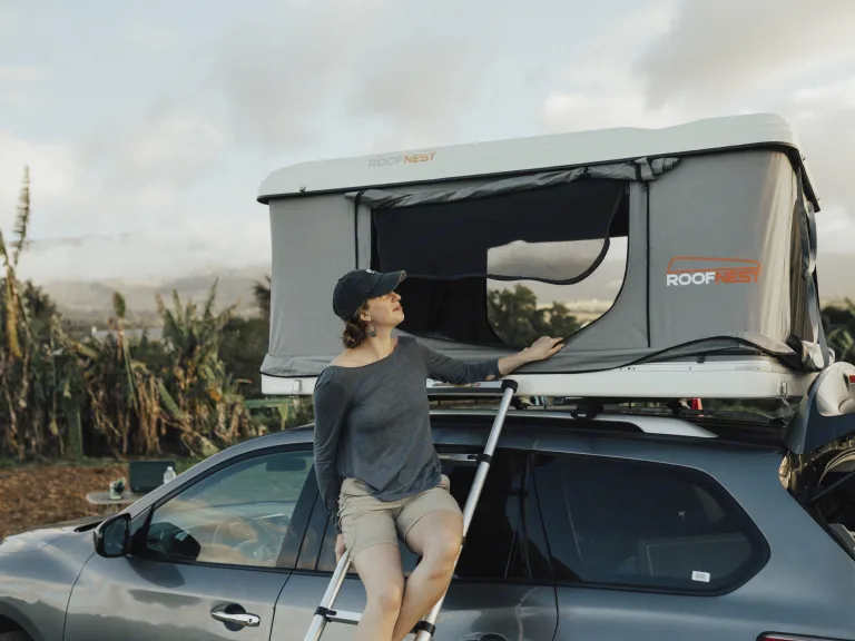 Gray AWD Nissan Pathfinder with Rooftop Tent, sleeps 4+