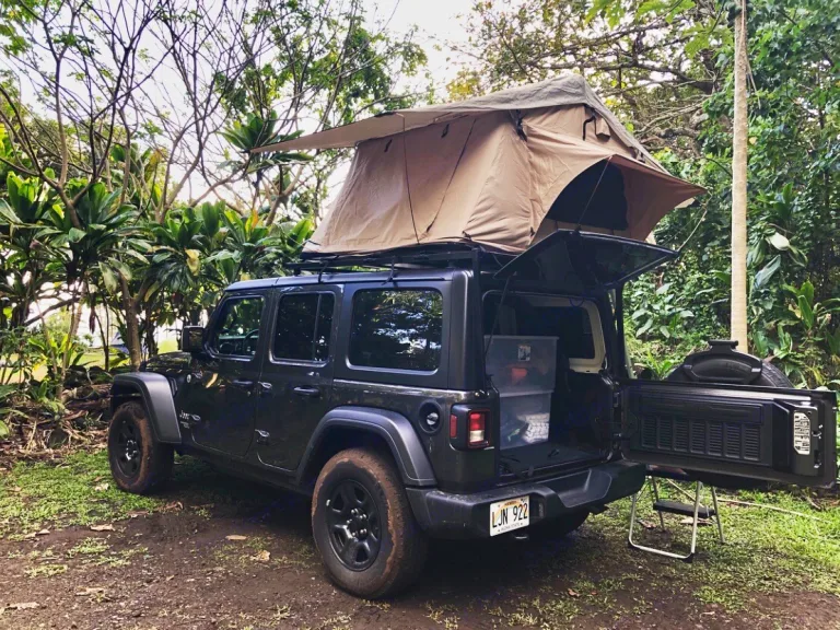 Fully loaded Jeep with a rooftop tent and all the essentials needed to get out and explore Maui.