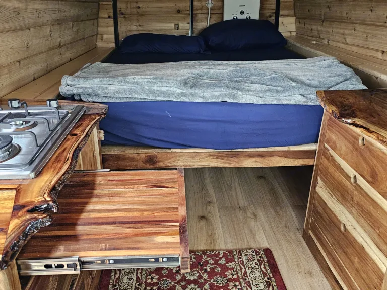 Many camper vans that you see you get a kitchen in a box and have to set up the kitchen if you want to make some food. This one is always set up and ready to go with a 2 Burner gas stove and a kitchen sink with a water filter for drinking water. The bed is a full sized memory foam mattress that slides out the back so you can sleep under the stars.