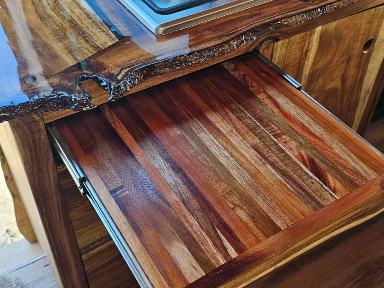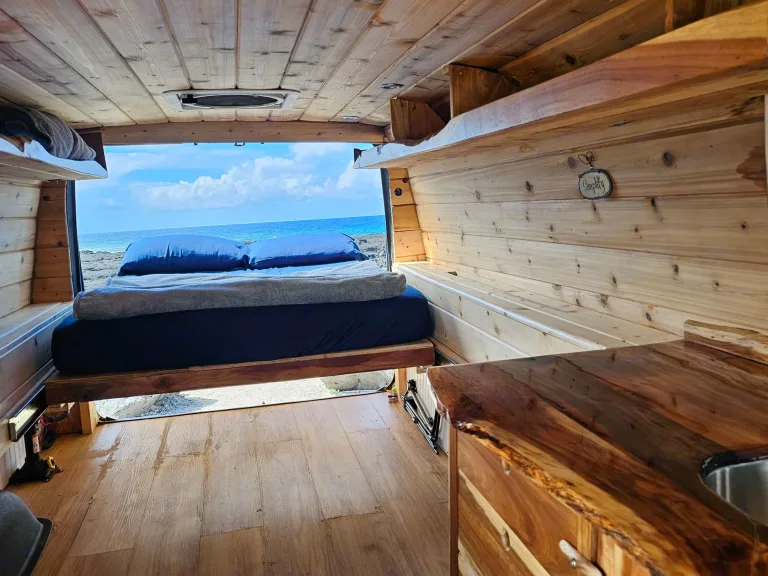 This converted 15 passenger Ford Econoline van is beautifully built into a camper van using precious Koa wood from the island. This van was my home for the first year living in Hawaii, so I've set it up to be efficient and comfortable. She is fully insulated and has a 14-in vent fan / ceiling fan right above the bed that keeps you cool all night long.