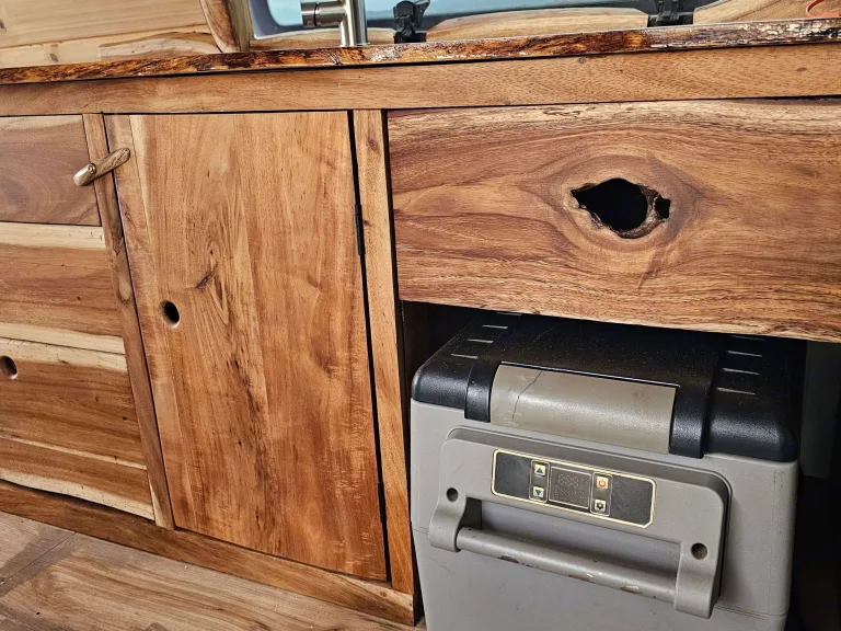 The onboard 30 gallon water tank supplies the high pressure water pump for an instant hot water shower and kitchen sink. French press, coffee mugs pots pans, and utensils are all included. Electric refrigerator/freezer is powered by the 200W solar system and independent House Battery.