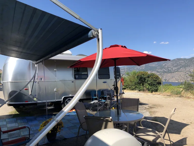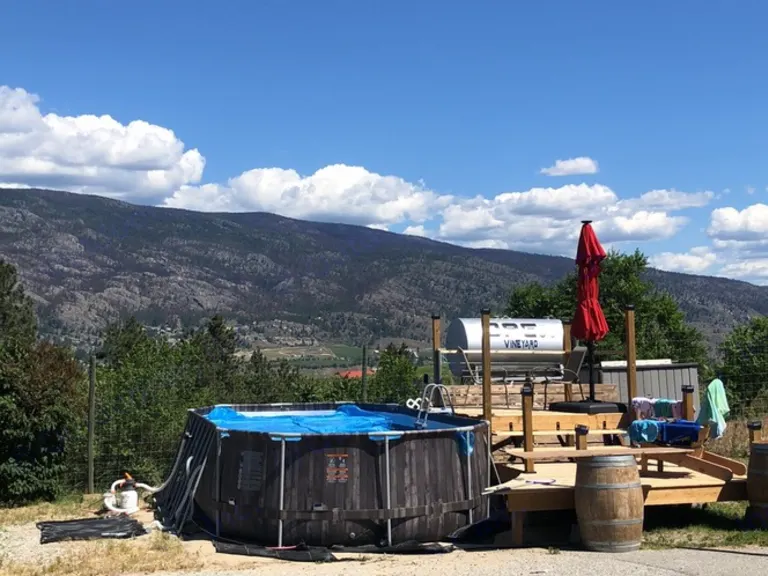 Or we can deliver to any campground you want within 100km from here. Fee applies.You will be in quiet Kaleden at OPG Vineyard and a 5 minute walking distance from two wineries.Please note that you will be living on the farm and that we have a dog who will most likely go and say hi from time to time.Pool will be closed after September 10. What's includedEVERYTHING! Bedding, propane, toilet chemicals, wine, chairs, BBQ. And if it's not in the trailer, just ask, we might what you need/want. RecommendationsBring your happy self and let's enjoy the South Okanagan. Other things to noteNo pet, no smoking. We allow other campers to join you ($35/n) but they need to be self sufficient.We rarely allow for towing. We prefer to drop off, set up and pick up. People allow to tow will need to meet certain criteria. If you are looking for towing a trailer, I'm sure there are plenty available.