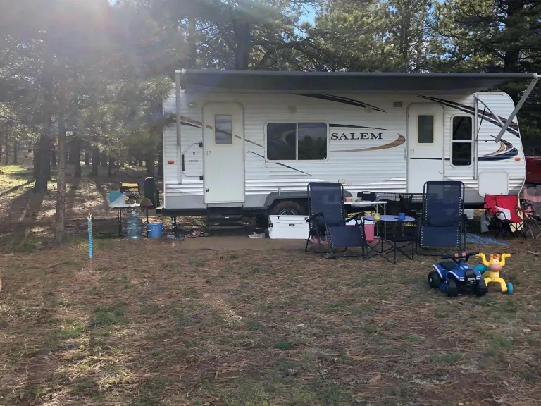 2012 Forest River Salem 22RKS. This trailer has a Queen bed in the rear of the trailer with storage above and underneath the bed. The dining table folds down to a twin bed and the couch pulls out to a full bed. There is a 32” Smart TV mounted in the front above the dining table. If internet or a hot spot is available it has several apps for television. It also has a DVD player for movies. There is a hot water heater, propane stove and oven, microwave, and a fridge and freezer. The kitchen and bathroom are both newly remodeled. Heater and Air conditioning both work. We provide extra water, coffee pot, cooking pans, and rugs for the outside. What's includedCooking utensils, extra water, coffee pot, outdoor rugs for below the steps, side table for handwashing station, linens for the bed, and soap for the kitchen and bathroom. We will send a more detailed list upon booking.
