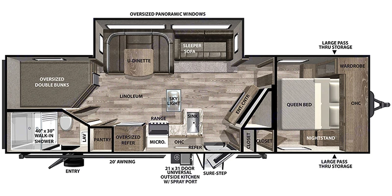 The RV comes fully stocked with all kitchen utensils including flatware, plastic plates, cups and bowls, pots and pans for cooking, grill accessories, and a Keurig Slim.