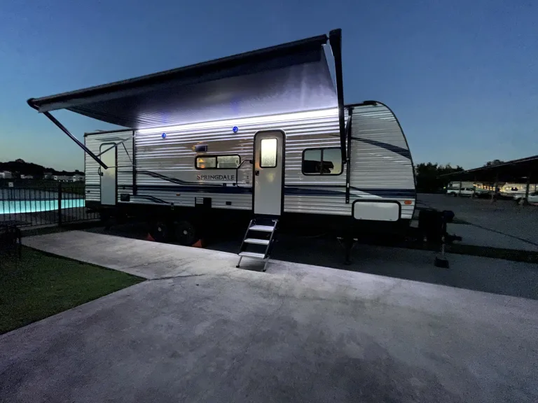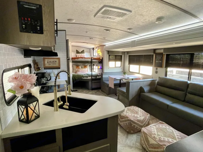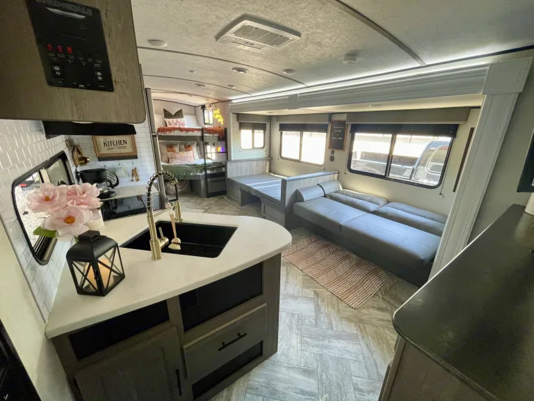 Very clean and organized bunkhouse perfect for you and your family’s next camping trip!2 a/c units to help beat the heat. One in the family room and one just for the primary bedroom to make sure you stay extra cool at night.The camper has 50 amp service, electric stabilizer jacks and electric tongue jack for easy installation and removal from tow vehicle. Also included is levelling blocks, wheel chocks and magnetic levels.There are dining utensils/dinnerware for 6 included and basic cooking/kitchen utensils provided. Please reach out for full kitchen inventory. Large pantry so that you can load up on what you need and a 10.7 cu ft fridge/freezer.Bathroom has 4 adult shower towels, 4 shower rags, 4 beach towels, toilet paper and limited shampoo, conditioner and body wash per trip.Primary bedroom includes a fully made queen size bed with a memory foam mattress topper and pillows with all the linens.2 full size bunks that are fully made with linens and pillows included.2 entries, one into the main living space and the other directly into the full size bathroom.Entertainment system with two zones. One zone is in the family room, and one is on the outside under the big 20’ power awning with led lighting. There are 2 foldable lounge chairs included in the rental.Smart tv in living room.We are typically flexible on pickup and drop off times upon request. During the week we will do our best to be available for your needs on pickup but due to work schedules it might be changed from posted times. Please reach out about pick up days to make sure we can handle your needs properly.Please ensure that your vehicle and receiver hitch are rated for the weight of this RV. Please reach out with any questions.10% discount to all nurses, first responders and military!! (with proof of identification)What's includedFresh linens for queen bed and full size bunks are included.