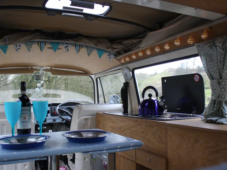 - Our VW Camper has a two-burner gas hob supplied with gas bottle and a stainless steel sink with electric pump. Both have glass tops, allowing for plenty of usable worktop space. We also supply an waste water tank. Theres also 40 litre Waeco fridge with built in small compact freezer compartment. The campervan kitchen is also well stocked with crockery, cutlery, pans, whistling kettle and most importantly a bottle opener!