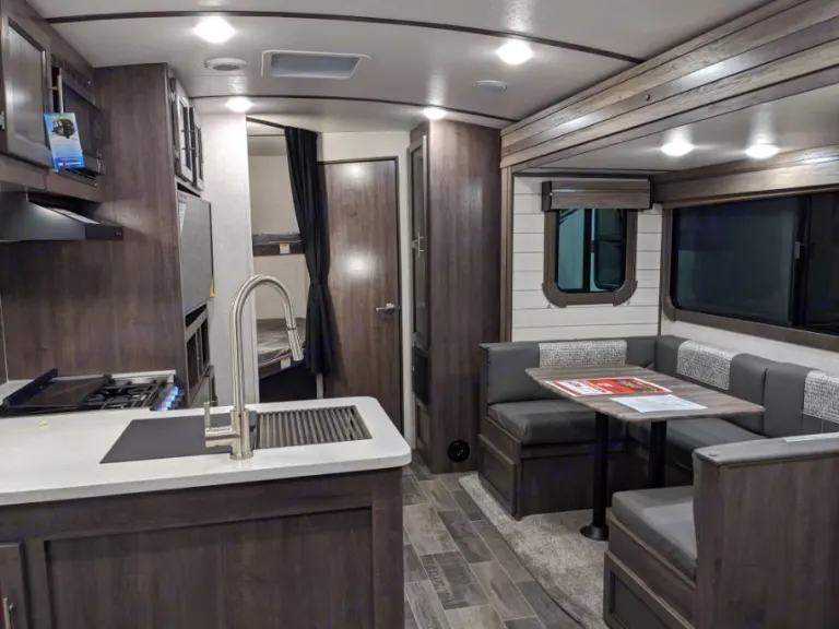 This unit has a slide-out which gives you extra space inside. It also comes with an outside kitchen and fridge. It has an outside shower and all-electric jacks. This is an all-new 2020 trailer with all you need to impress your family!
