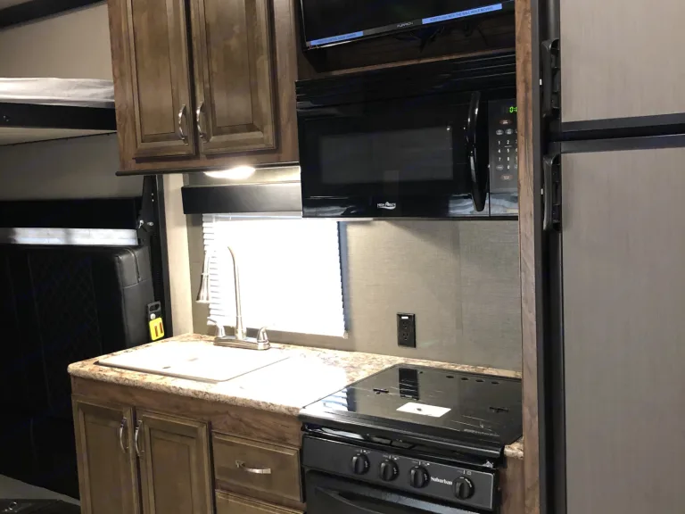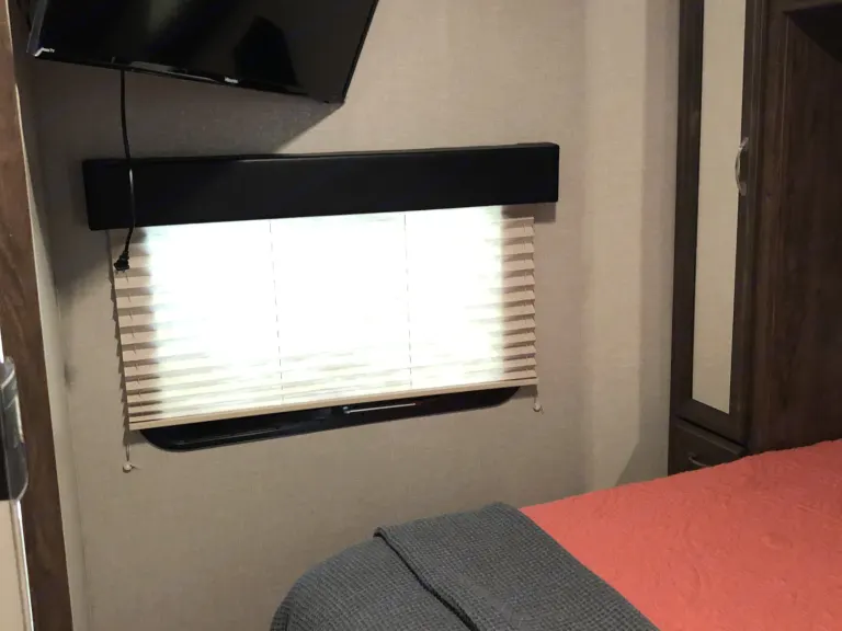 This is a Half-Ton Haulable Toy Hauler. Rental would include weight distribution hitch. The trailer is equipped with a Onan 5500 generator that will power the whole RV. It has dual AC units. Outdoor TV Mounting. Two TVs inside. Ceiling Fan in Kitchen. Private King Size bed room. Separate Bathroom with access from living and Bedroom.