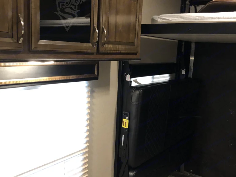 Has two motorists queen size beds in main area. Convert to couches when not in use. Has drop down Canvass doors for back ramp. It has awning. Work lights all around. Underglow and porch lighting. 100 gallon fresh water and 50 gallons black and gray water.