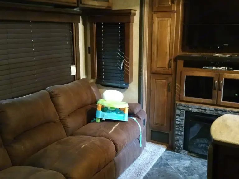 10' garage area converts to second bedroom with two queen bunks. Both bed rooms have tv and DVD. The master has a queen bed. Large tv in living area over fire place. Rear door doubles and party deck with 3rd awning. 2 main awnings are electric and provide large outdoor area.