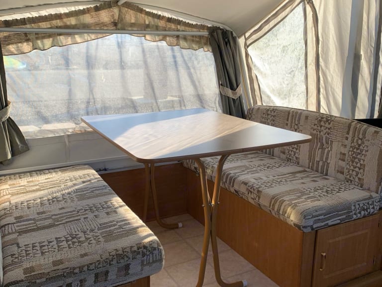 Just what you’ve been looking for a getaway or weekend trip. This spacious tent trailer with slide out and toilet will accommodate your whole family or friends and then some with 9 person capacity. It is equipped with 2 king size beds. Dinette & pull out sofa converts into a bed as well. Lot’s of storage, options for indoor or outdoor cooking, portable dinette table for convenience, microwave, 2 portable small fans, Tv/DVD player, furnace, kitchen sink & water tank that holds 20 gallons of fresh water. The toilet inside has a porta potti storage and it has an outside shower. It is super lightweight, so you can pull behind your midsize SUV with no trouble. Also for your peace of mind, there are four stabilizing jacks on the corners attached underneath. Small pets are allowed on a case to case basis. Please inquire during rental. Sanitized & deep cleaned before every trip. Making sure your trip runs smooth is my priority so I will provide a demo on how to setup and tear down upon pickup or delivery. Feel free to contact me if you have any questions before & during your trip. Let’s get this party started and get you off to your next adventure!*Please Note THE Trailer Requre A 7 PIN Hookup. Will NOT Work With 4 PIN TO 7 PIN Adapter.What's included-1 Full Propane Tank