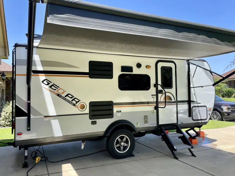 This GeoPro is a 2020 camper equipped with a full sized bed, bunk beds, and a dinette that can be converted into an additional full size bed. The Pro also has a slide out to maximize the "living room" and has a full kitchen including stove, oven and microwave. Full bathroom, including tub, which is a great bonus for small kids! Air conditioning and heater included. Solar makes it possible to live off the grid - almost everything can be powered with solar batteries except for microwave and AC. This camper has off-road tires. The Pro is a great camper for a family, yet light enough for a midsize SUV to pull short distances. What's included4 camp chairs