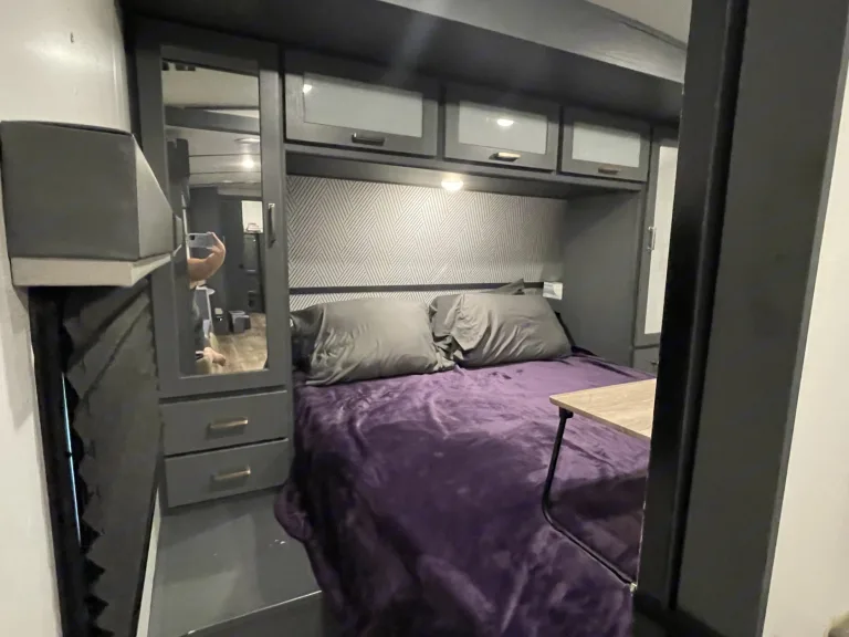 Perfect camper if you want to just show up and camp. It’s like an home away from home. Includes fresh bedding, towels, wash cloths, cookware, utensils, paper plates, cups, knife set, literally everything except your guests and clothes. It even has a flag themed picnic table and bench cover set along with an outdoor mat. The outdoor kitchen features mini fridge for your beverages and propane cooktop. The outdoor shower is nice to rinse off or clean gear. It has 2 air conditioners and needs 50amp to power everything. 30 amp will power only the main AC. The back bunk room has 3 bunk beds with closet storage and a 4th dinette that converts into a bed. A toddler playpen also fits where dinette is. The Queen Master bed has 2 sliding doors for privacy on opposite end of bunk room. 2 leather recliners in living room fully recline if you want to relax. The kitchen has microwave, large fridge and freezer, oven, 3 burner cooktop and all of the necessities to make a great meal!