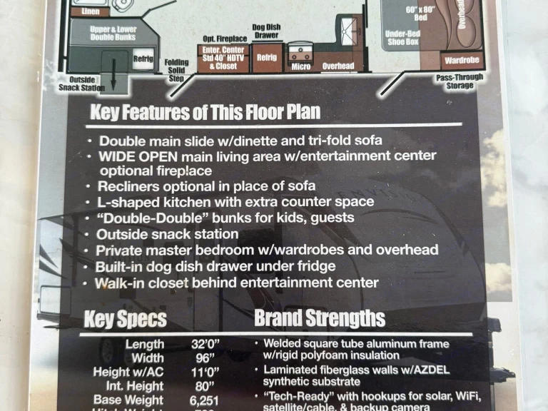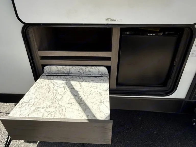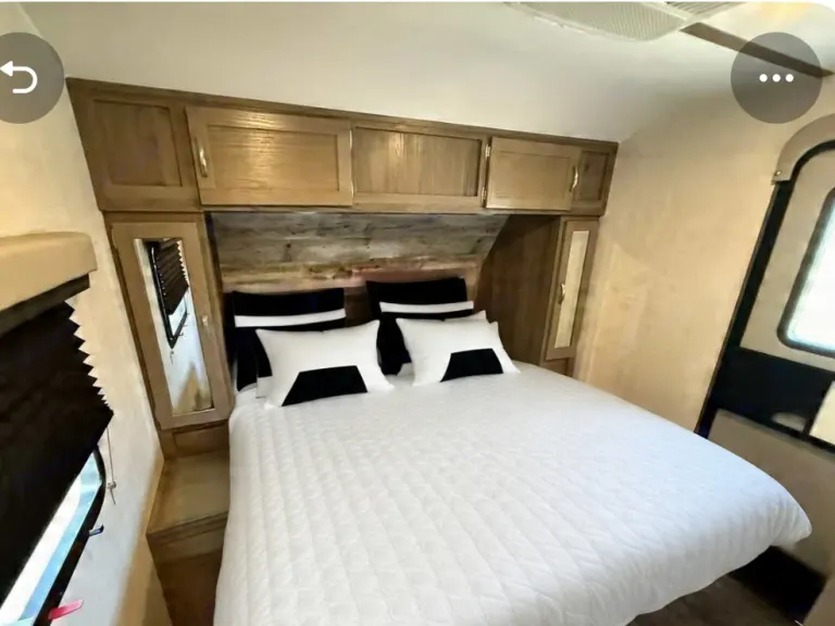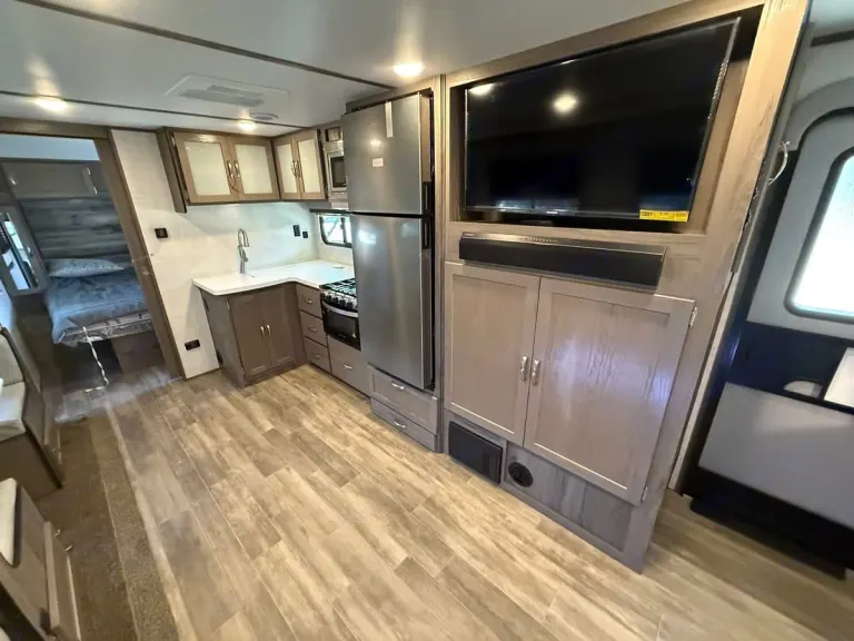 RV is stocked with everything you need for cooking, bedding, bathing (except some personal hygiene items), Keurig coffee maker, Turkish or bamboo towels, nice quality cookware, utensils, dishes, knives, and many extras, by request, like an air fryer, instapot, snow cone machine, blender, margarita machine, jand many other options available to add. Just ask! Very nice shower with sliding door for complete privacy. It has a huge pantry, shoe storage and even a drawer for pets water bowl built in! Indoor sound bar, full size upgraded sink faucet, appliances still have plastic on them! We just bought this RV. It’s like new!
