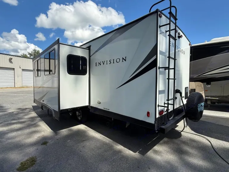 2023 Gulf Stream Envision – Sleeps 8 + (2) comfy recliners for vibrating massage, heated with LED lights, charging ports. King size Bed in master bedroom with private door to outside and privacy! Outdoor mini fridge w/snack bar, outdoor shower, watch tv outside, huge electric awning.