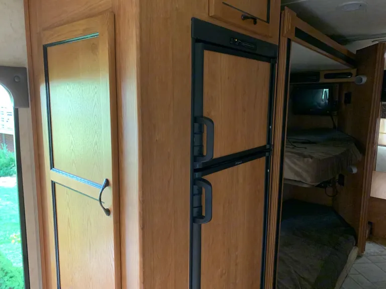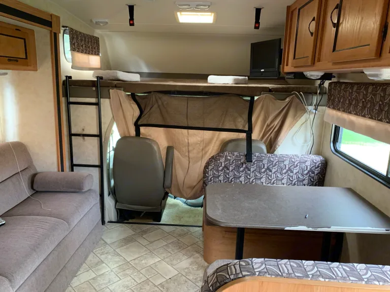 Class C motor home with two slides and bunk beds and fully self-contained. This RV can sleep 8 people very comfortably, including two on queen bed, two on bunk beds, two over the cabin, one on the jack knife sofa bed and one on the dinette conversion bed. It is built on a Ford E450 chassis and equipped with V10 triton. Very powerful, while easy to control. The ride is very smooth thanks to the rear air-bag suspension. Lots of storage room for all you camping gadgets.