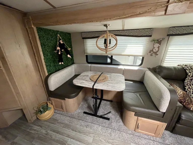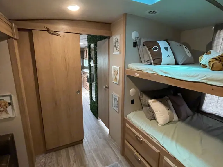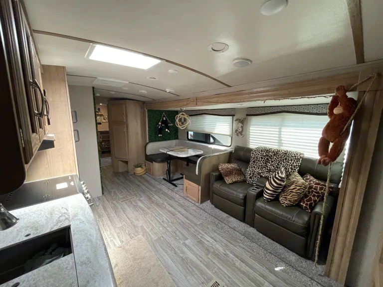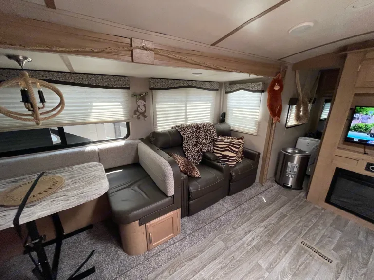 Decoration - SafariWant plus storage, plus living space, plus features? Then come home to the Minnie Plus trailer. Spacious floorplans begin with residential sized queen beds, full depth slide outs and private bathrooms. Solid surface counter tops, stainless steel sinks, bright interiors, and an abundance of storage inside and out, taking 'glamping' to a whole new level.This is our second baby, Lightweight under 8000lbs easily towable and ready for your next adventure! Fully equipped and ready to go, pack only your bag and hit the road!AttentionFree Delivery TO Fort Wilderness AT Disney Only FOR Those WHO Rent More Than 5 NightsWe will deliver within 60 miles, minimum $200 - Round TripSet up and dump tanks for an additional $175.00.Cleaning fee $100 is required.OptionalWe have Kitchen Kit (with all utensils) charge separately $50