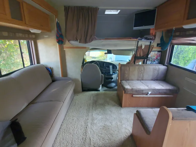 Above the cab is a full size bed that comfortably sleeps 2. There is also a TV with DVD player here. If you need extra sleeping arrangements, the couch folds out and the table folds down to accommodate up to 4 more sleepers.