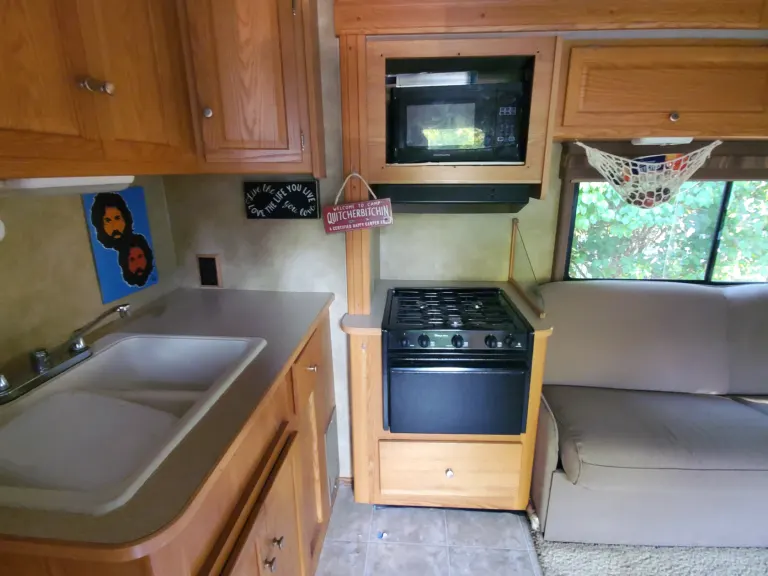 You'll have a full kitchen with propane stove top and oven range. Microwave oven, sink and counter space provides all the comforts of home. The RV will come full stocked with dishes, pots, pans and utensils. Basic cooking supplies like spices and herbs will be available!