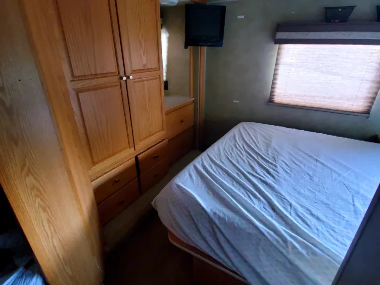 You'll travel in style and comfort in this 31' spacious RV. With 2 slide outs, this RV can accommodate up to 10 sleepers. The master suite has its own slide out, making it roomy and comfortable with a queen bed. Fully equipped with TV, closet and extra storage, located at the back of the RV for privacy.