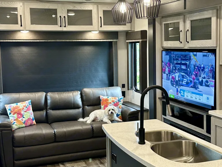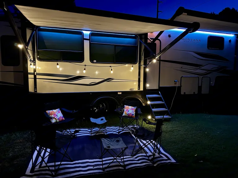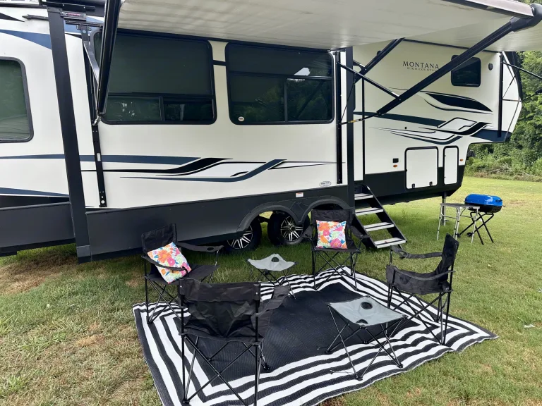 For outside entertainment, we supply four folding chairs with two folding tables, area, rug, charcoal grill with accessories, folding table for cooking, Edison style string, lights, and 4 inner tubes.This RV is delivery only. We will deliver, set up, and pick up to your destination. The first 50 miles is $150 and each additional mile is $3.50 per mile. The cleaning fee is $75. We are pet friendly with a pet fee of $50. Small dogs only.When scheduling your campsite, remember that this rig has three slide outs, is 34 foot long, and needs 50amp power supply. RecommendationsPigeon Forge/ Gatlinburg are always camping hot spots, but there are countless RV locations in our area such as Anchor Down campground in Dandridge, TN, which has a deluxe setup.