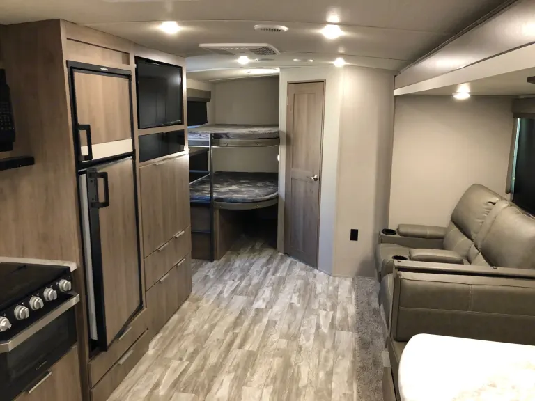 This is the perfect floor plan for a family. The kids will fall in love with the bunk beds, and the parents will enjoy using the master bedroom's exterior door to sneak out once the kids are asleep. The trailer includes a full setup kitchen, a pair of heated recliners with massagers, a table to seat 5, a spacious refrigerator, and a set of kitchen supplies to make your trip grand.We provide a weight-distribution trailer hitch and will teach you how to hook up, disconnect, and setup the trailer. You'll have our cell number, and you are welcome to call with any questions or issues that arise on your adventures.