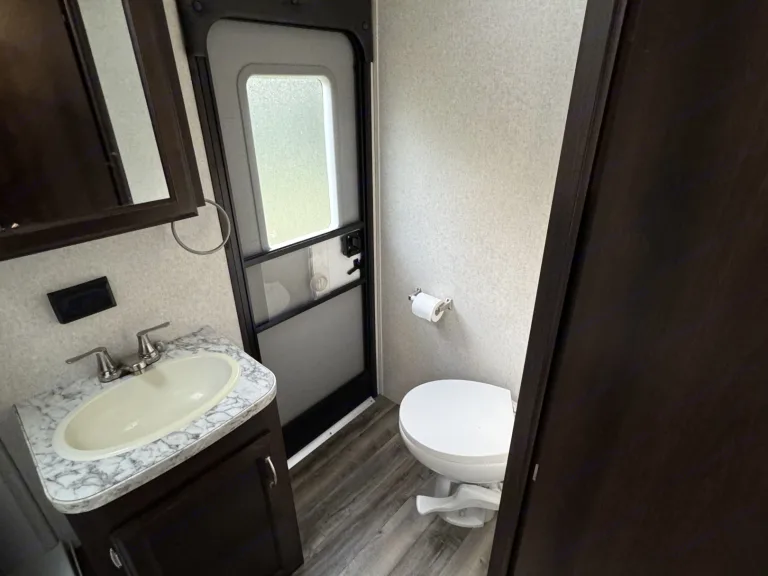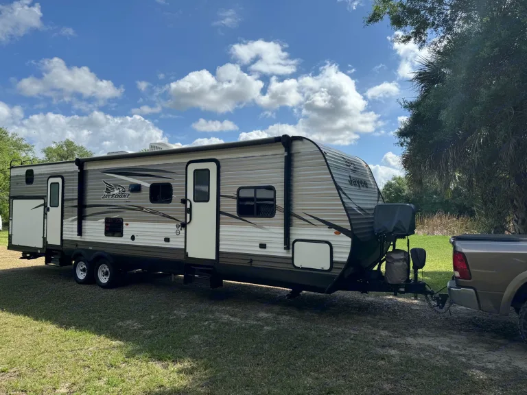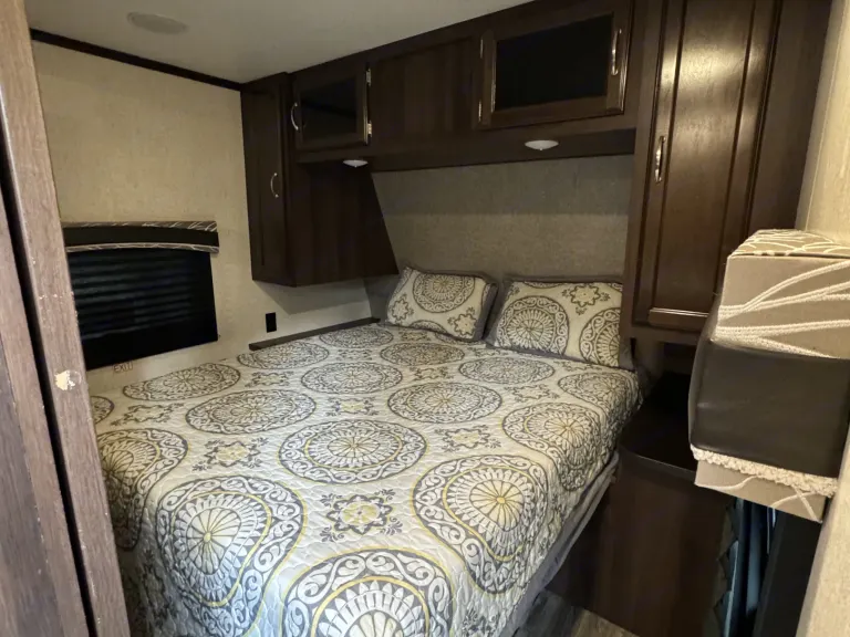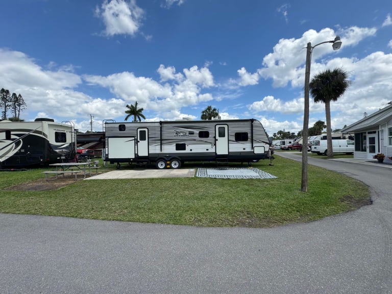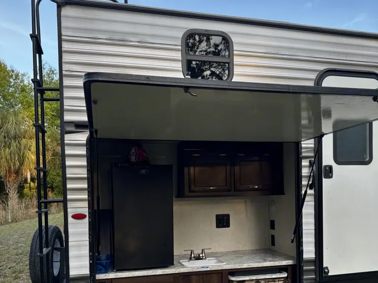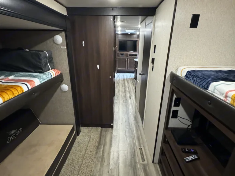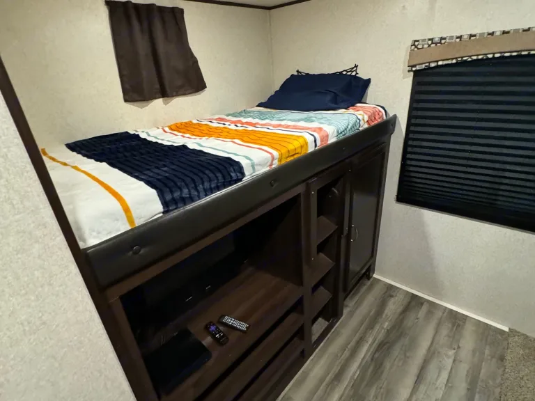 Delivery Only! Renter Cannot pull camper.Living space is 33ft long. Has a front master bedroom with a queen bed and two wardrobe closest. Back bunk room has three rv twin beds, tv and is own privacy door. Wrap around dining table and pullout couch in living room. Outside there is a outdoor kitchen with a sink, mini fridge and two burner gas stove.What's includedItems included: