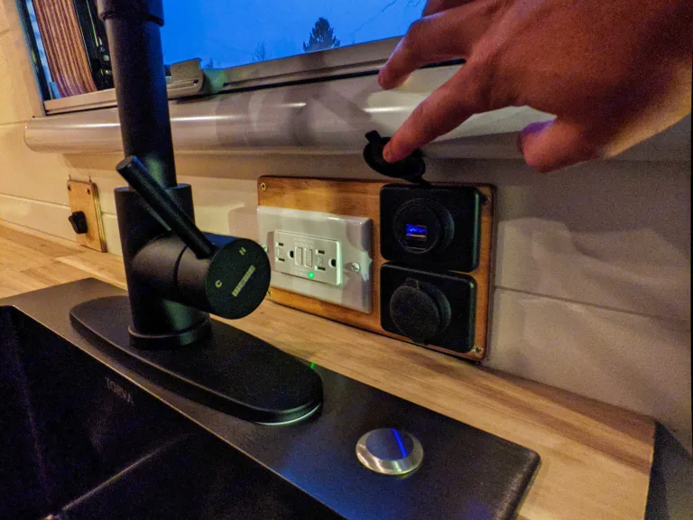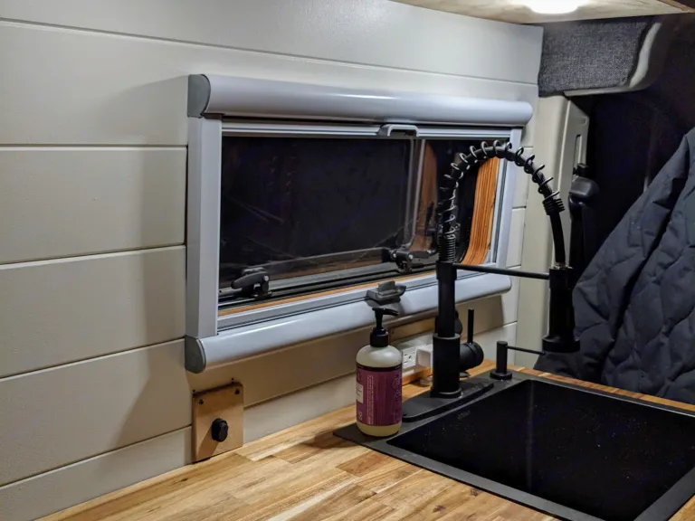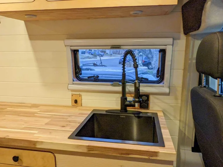 12V powered water pump kitchen sink with tank filled at pick-up (20+ gallons fresh water) note: No Hot water pump- WATER UNAVAILABLE FROM NOVEMBER TO APRIL 1 (pending weather, please inquire about your location/dates if you have questions)