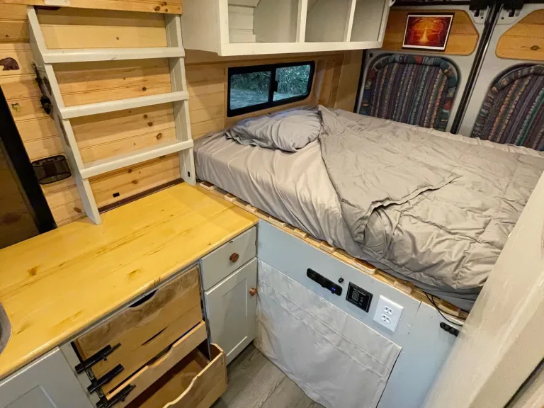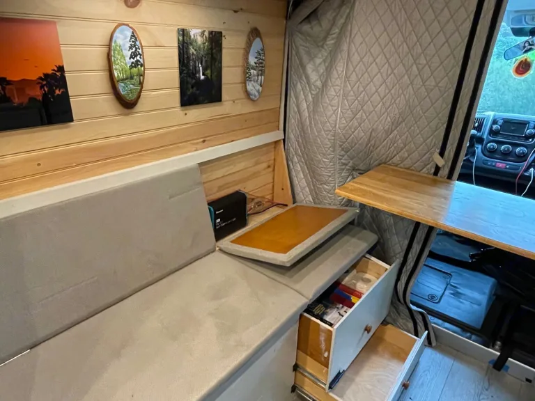 Create the perfect getaway on wheels with this custom converted camper van. Home includes: AC, dimming lights, fridge, kitchen with foot pump sink, spacious drawers/cabinets, microwave, solar panels enough to survive apocalypse, bunk sliding window with overhead fan, diesel heater with temperature control system, full size mattress, curtains to fully black out inside from outside (total privacy), funky artwork inside (for the aesthetic).What's includedHouse AC, House Heating, Roof Fan, Fridge/Freezer, Dimmable Lights, Microwave, Navigation, Rear View Reverse Camera, Fire Extinguisher, Sink with Fresh/Grey Water Tanks, Stove, USB Charging Ports, Radio, Fresh Linens, Fresh TowelsRecommendationsTake this thing anywhere. Stealthy camping, or legit camping spots, you name it.Other things to noteNo smoking, pets, parties.
