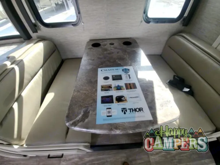 This motorhome is ready to hit the highway when ever you are! Enjoy at home comforts like a rear private bedroom with a 60" x 75" queen bed, a closet, a dresser, and TV prep. There is also a 40" TV above the 71" Dream Dinette for even more entertainment. Freshen up each morning in the full bathroom with the 32" x 32" radius shower with a skylight for added natural lighting then fill your bellies with some yummy bacon cooked on the three burner cooktop. Next to the kitchen pantry is a large closet for your storage needs. Relax in true comfort at night on the 68" jackknife sofa and use the 52" x 96" bunk over cab for another sleeping or storage space!Experience a smooth ride to each destination with the Ford E-Series chassis or optional Chevy chassis on these Thor Motor Coach Chateau Class C gas motorhomes! The 31 ft. models even feature a MORryde SmoothTech ride suspension system and automatic leveling jacks with touch pad controls for easy set up. They are constructed with a welded tubular aluminum roof, sidewall cage construction, vacu-bond laminated roof, walls, and floor with block foam insulation to keep the heat and air conditioning inside. The slick fiberglass exterior with graphics package is sure to turn heads down the highway too. Come find your favorite one today and get on the road!