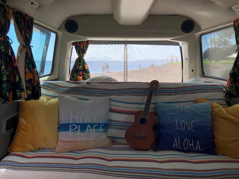 Surround Curtains for sleeping privacy AND custom mosquito netting for back hatch door so you can enjoy your evenings along with staying cool with the ocean breezes without the bugs!! This van even is equipped with the latest full front wrap around for noise, light and sunlight (heat) insulation.The Rules of The Van 1) Not allowed to drive up Haleakala 2) No smoking 3) No pets 4) No towing 5) Use only highest octane fuel - 92 6) Van must be returned full of fuel. 7) You must have full coverage on at least 1 vehicle you personally own. 8) You must take a shuttle to the VAN in Kaanapali (just north of Lahaina in West Maui. The cost is only $25 per person (plus tax) We DO offer Airport Drop OFF for $50 but we longer offer Airport Pick UP since we have found the shuttle service is much faster (and the same price) than us driving to the airport to pick you up (due to West Maui traffic going TO Kahului) 8) Check in 3pm and Check Out is 11am. These are our standard times, exceptions can be made IF the schedule allows and we have adequate time for cleaning and maintenance.Please be sure to select your choice of 'Add Ons" for example, 2 sets of snorkel gear, hammocks, cook set, dishes, pots, pans, bedding (sheets, pillows, blankets, sleeping bags) soft-top surf board, Stand Up Paddle Board, boogie boards, beach chairs, etc. We have them to rent. Sure, other listings or companies might say that stuff is included, but let’s face it “you get what you pay for” and it’s usually trashy.By the way our sleeping bags are #1) Soft cloth, not that sweaty nylon #2) Square and roomy, NOT a narrow Mummy Bag #3) The are oversized/long in case you are Tall like Eric and #4) They zip Together in case you are feeling cozy and romantic ;-) It's ALL in the details....Still not sure about camping for your Hawaii vacation? Well, let me tell you. This is all about beating the crowds. Going left when everyone else goes right. This is not the kind of stuff you get staying at some over-priced resort with the masses. Welcome to the Real Maui. You will see and feel what usually only the locals get to experience. True Intimacy with the Pacific Ocean and all that Maui has to offer. But you Need the quintessential surf van to make it happen.Also. this one is NOT like Most other VW's you see online to rent. Unlike most Maui VW campers (owned by big companies) that are rented to the masses and look nothing in person like they do in the photos. This van is special. Why? Well it is one of our two babies. Named “Espee” after the Spanish word Esperanza for Hope. She’s a 1987 VW Vanagaon designed to bring you straight to the Aloha Shaka vibes and of course the Surf.