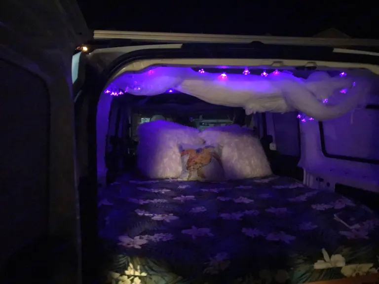Spacious converted cargo van. This is the perfect vehicle for Hana. Not too big, that it’s hard to get around our small curvy roads, but still has Queen sized mattress. Also fairy lights, rooftop shower, bug net, and cold ac! Platform folds into a bench, so extra room for surfboards, and other gear, or can just chill in the van if the weather is bad. Comes with all cooking gear, lanterns, pillows and sheets, coolers, beach towels, and beach chairs for 2 people. *butane not included. Need anything else? Just ask. Great on gas! Free pickup anywhere in lahaina, or can be deliver to Kahului airport for a fee. Also, can send you a link for all camping on Maui.