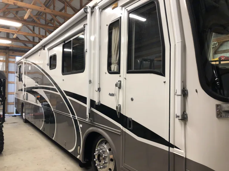 Diesel pusher with 2 slides queen bed in back, 2 fold down couches in front, 1 bathroom, outdoor refrigerator/freezer, outdoor shower, plenty of storage, 1 tv in front & back bedroom