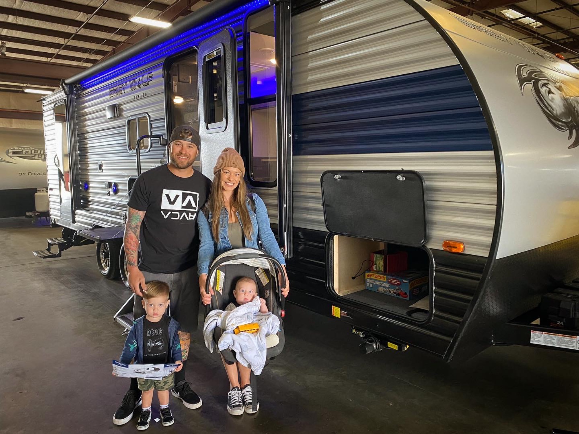 Hello!Thank you for showing interest in our 30’ 2022 Travel trailer! Our trailer is brand new and we are so excited to share it with fellow adventure lovers! Our trailer has solar, sleeps 8 (2 enclosed bunks, 1 fold out and the master), has a fireplace, TV, led lights, large bathroom with a bathtub & shower, large kitchen including all amenities and plenty of storage and dining space! On the outside of the trailer there are speakers, two outside showers, a mini fridge, ice maker, led lights, led awning, bike rack in the back, back up camera, corn hole, 6’ table, fold out camping chairs, complimentary unlimited generator usage. There’s also two doors to the trailer, one conveniently to the bathroom and then the main door to enter the trailer.Dry weight: 5550lbs
