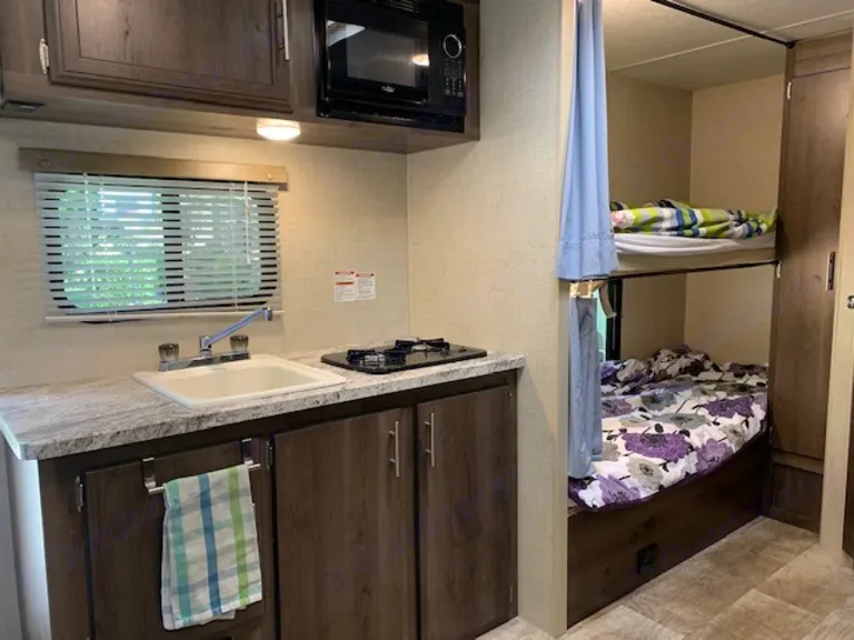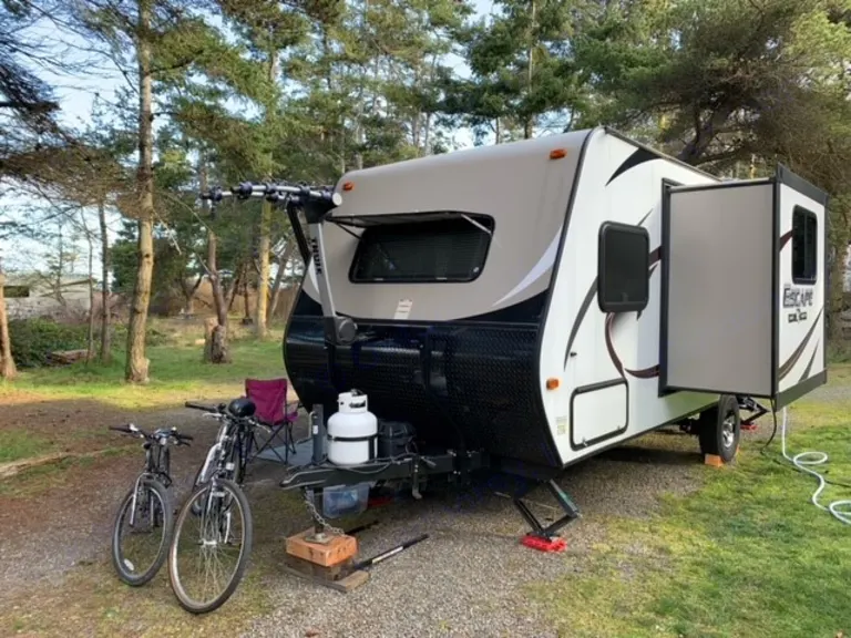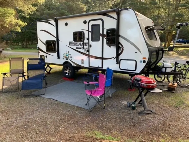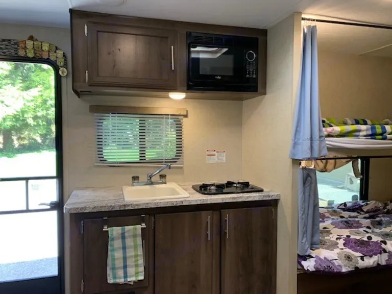 Summer 2022: calendar is very limited at this time. It will open up a bit as my own travel plans are confirmed.Easy family camping in a bunkhouse trailer. Super clean and well-maintained. Step up from a tent with a slide-out dinette and a generous fridge. Adults can sleep in a queen bed, kids can use the bunk. A small child can fit on the converted dinette bed. Fully equipped with heater, a/c, 2-burner stove, microwave, sink, bathroom with shower and vanity, power awning with outdoor lights and speakers. Lots of storage in front lockers. Easy towing with an SUV; weight-distribution hitch provided upon request. Fast set-up. Take it out for a quick weekend trip, or set up basecamp for a longer adventure. Pets welcome for a fee plus deposit. What's includedPortable propane grill (Coleman Roadtrip), dishes, cookware, utensils, Keurig coffee maker, outdoor rug, 2 reclining camp chairs, 2 folding camp chairs, fresh linens and towels. Broom and cleaning supplies. Water hose, power cord, drain pipe. Toolkit and cordless drill to easily adjust stabilizers.RecommendationsMinutes north of Seattle. Central Puget Sound location, easy access to I-5, US 2, and ferries. Cruise the Olympic Peninsula, explore the North Cascades, head over to Leavenworth, or check out any of the dozens of Washington State Parks along the Sound. Other things to noteIncludes a sturdy bracket for your own hitch-mount bike rack above propane tank (between vehicle and camper), or use ours for a small fee. Usually fits 2 adult bikes, or up to 3 kid bikes, depending on your set-up. Dual-fuel generator available for small fee (to recharge batteries or run a/c or micro). No smoking. Pets with pet fee and refundable deposit (see Add Ons).