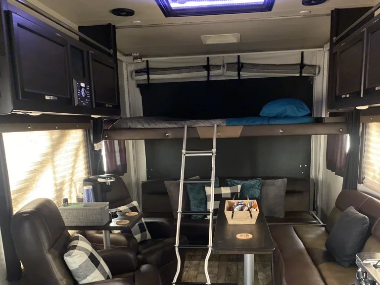 The toy hauler is ready for a fun trip down by the river, lake, or desert! It’s a beautiful dark interior setup that sleeps 8 people comfortably with a nice cold A/C for the hot summers and a heater for the winters! It includes a full bed and a queen bed with two fold down couches. This includes bedding, towels, and washcloths. It is also cleaned with an industrial grade sanitizer/virucide/germicide prior to your arrival!The toy hauler also includes a full kitchen stocked with everything you need to cook (minus the food). We also provide propane and gas for the fueling station upon request. Charges apply based on usage.Everything you need for a weekend of fun... we got you!