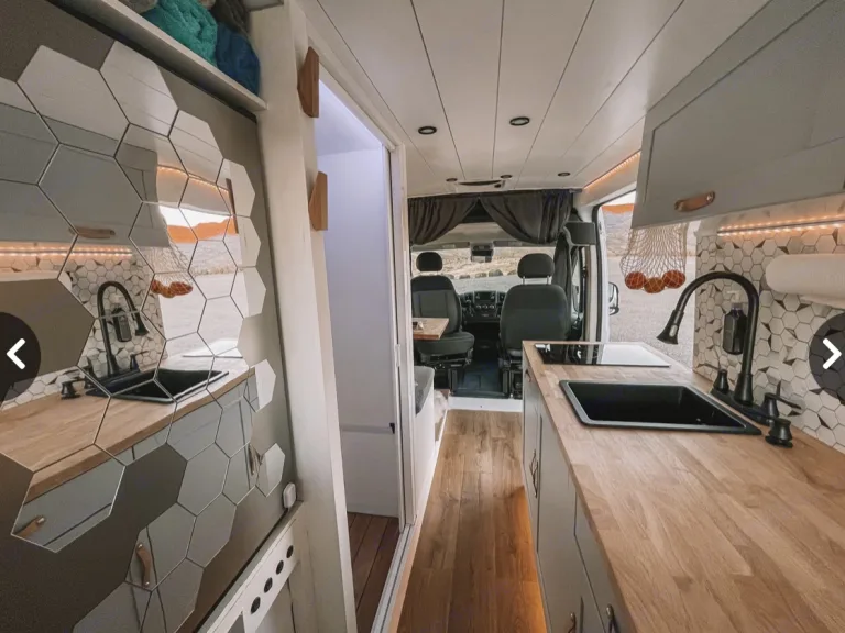 2021 Dodge Ram Promaster 3500. High roof (My 6’7” friend can stand up in it!). Everything needed for a weekend at the beach or in the desert. Fully powered inside by two Solar panels on top. Stove cooktop, sink, lots of counter space, storage, refrigerator, shower, composting toilet, on demand hot water, WeBoost internet range booster, Diesel heater furnace, auxiliary back door locks for added security, rides and drives like a car, easy to maneuver and park in smaller spaces, lounge platform/ deck on top, 35 gallon fresh water, 20 gallon gray water tanks, large “garage” storage area in rear under bed-accessible from inside and outside, entire van window covers for blocking out sun and also keeping you hidden and in stealth mode, front window safety vents, roof fan, 110V room air conditioner available (must be plugged into exterior outlet-cannot run on van solar system) Perfect van for a day of shopping, sightseeing, festivals, or sporting events because it has a toilet and fridge for food which are sometimes difficult to find out and about.