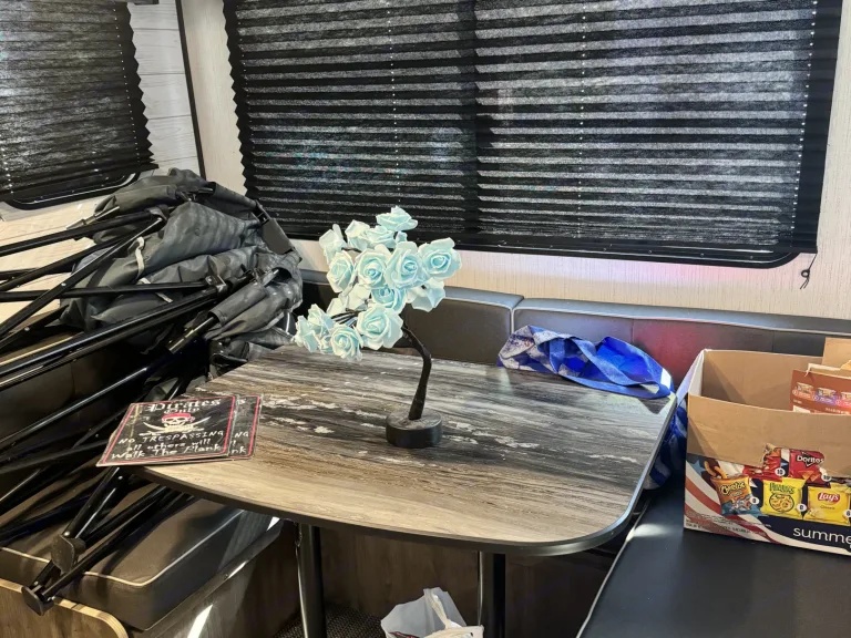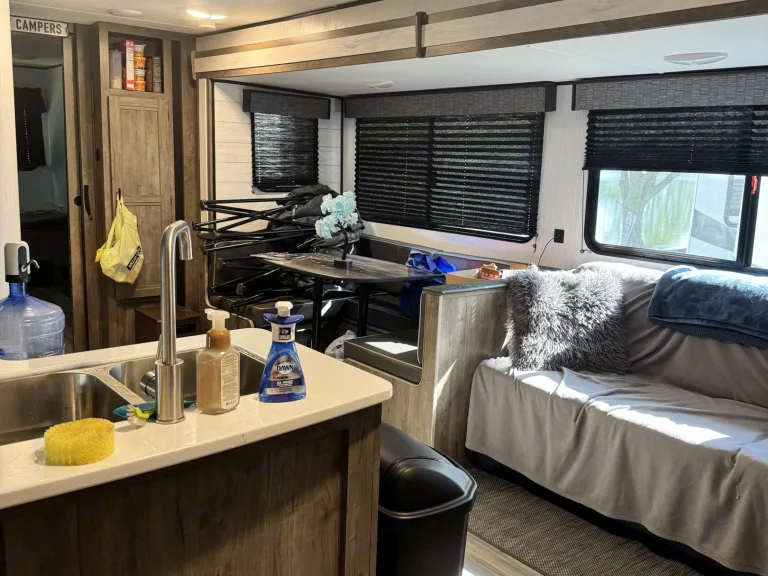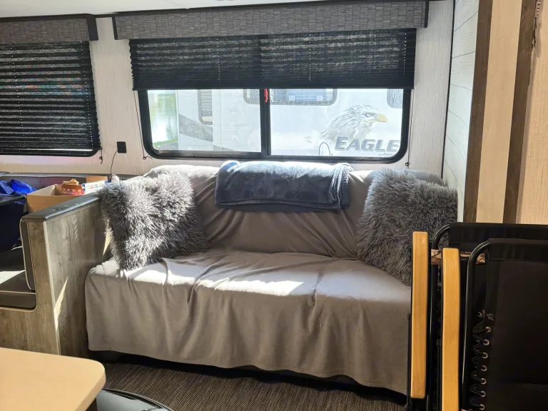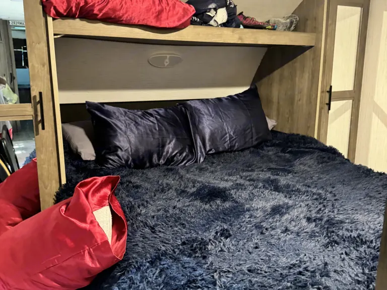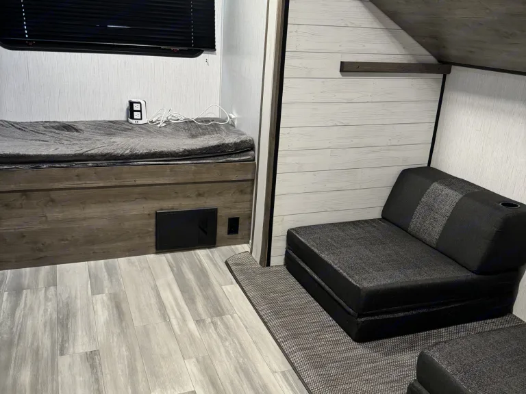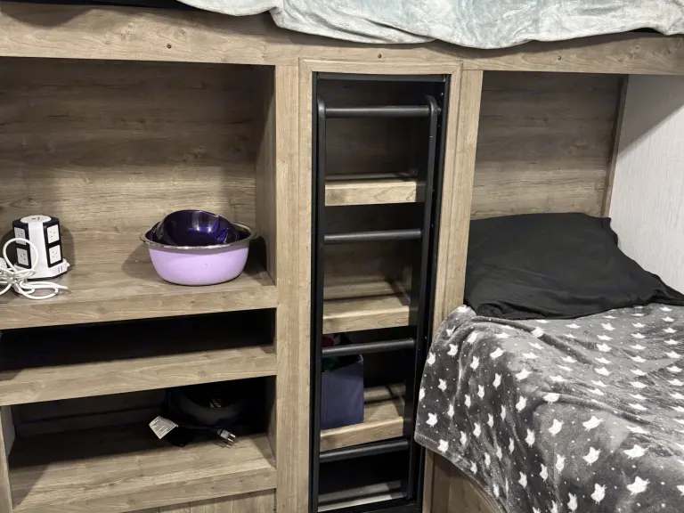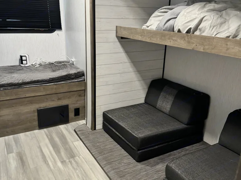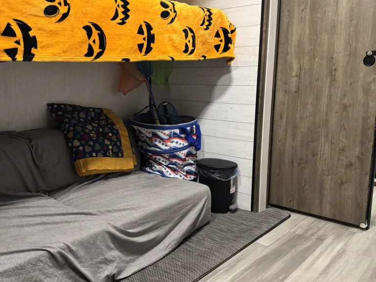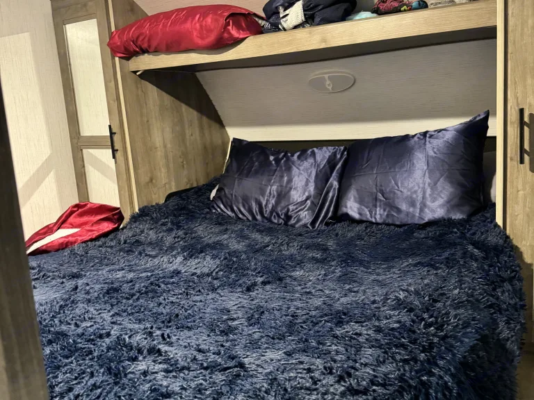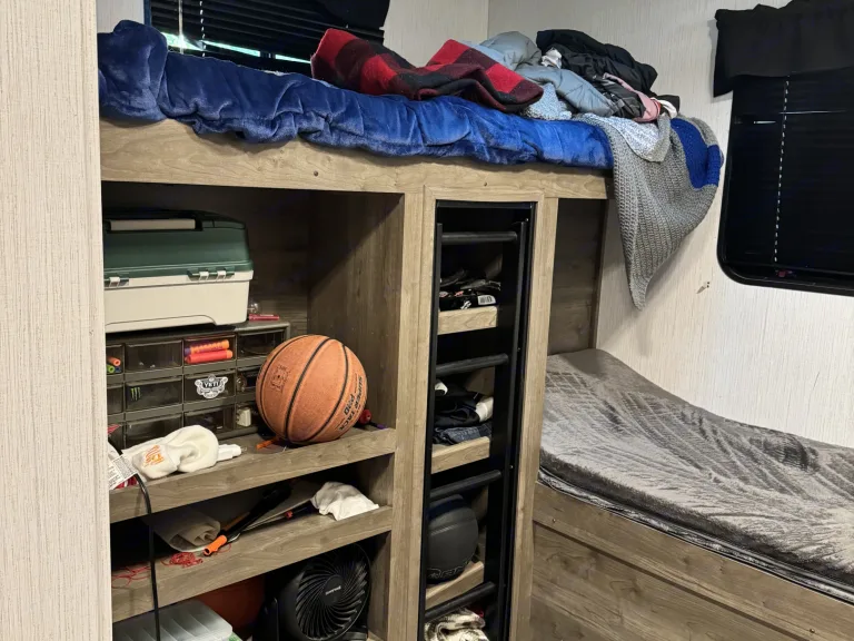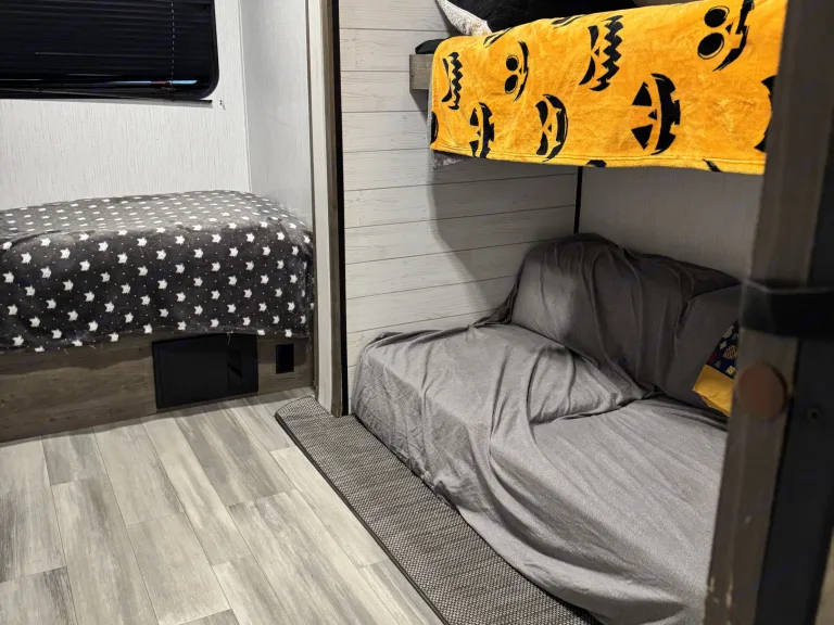 Family-owned and we still use the camper for our own camping adventures as well, just not as many as we use too. Now my teenage son and I would like to share our home away from home with you.Memorial DAY, 4Th of July, and Labor DAY are minimum of 3 day rentals.We delivered camper, do the set up/take down and even empty the tanks at the end.All you have to bring is the family, your clothes, food and drinks and pets if you like. We do all the work so you don’t have to. You can elect for a Turnkey experience where we set everything up before you arrive and text you any details needed. Or meet you there and give you a personal tour of where all the important buttons and information would be.Master Suite- sleeps 2Master bed is a queen bed with 4 inch memory for a pad and 2 inch mattress topper. There is walking access on both sides of bed. There is a storage cabinet on each side of the bed as well with a mirrored front. There is also a storage shelf above the bed. There are 8 beach towels in the cabinet to the left of the bed. On each side of the bed is an opening to the storage cabinets making them like a bedside table. Inside is a USB port for a charger and light. There are doors on each side of the bed as well for added privacy. Master bed is made prior to your arrival and has 4 pillows, sheets, blanket.THE Bunkhouse - sleeps 4-5Is very spacious with one of the slides and has 3 twin size beds with 2 inch memory foam padding and 2 gaming chairs that can be folding out on the floor as a full-size bed or leave them as two twins if needed.