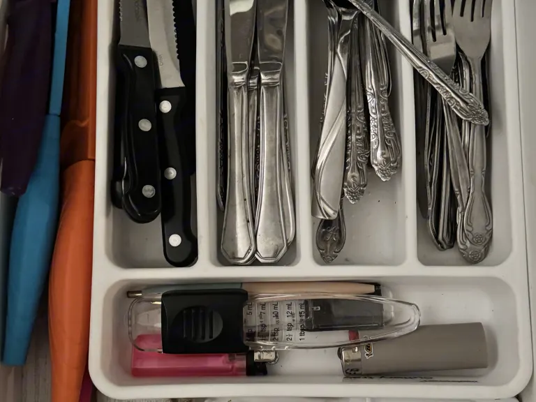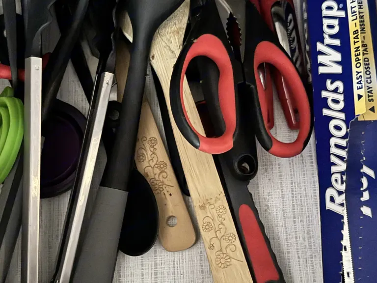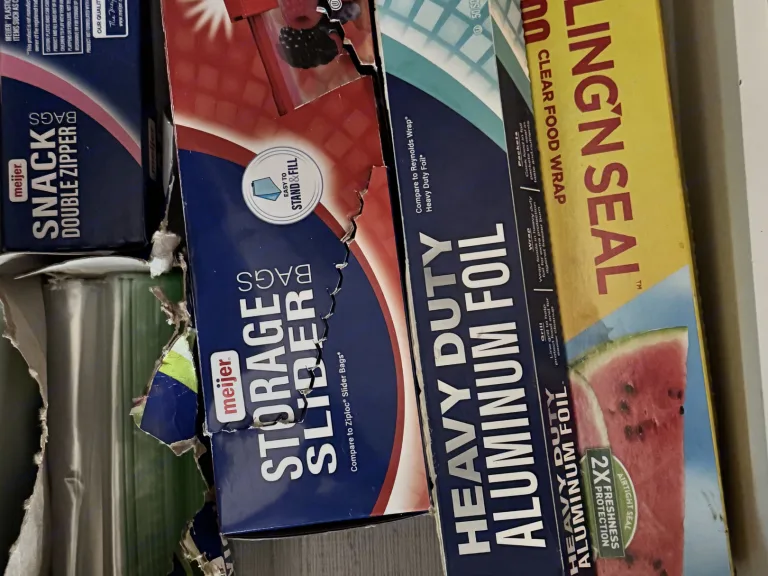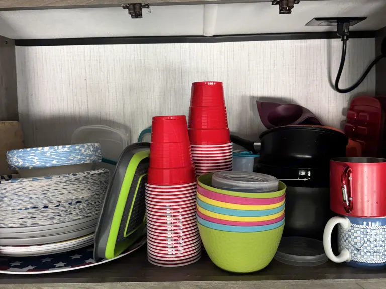 Cutting boardDish soap, hand soap, cleaning supplies, ziplock bags, trash bags, and extra rags. Ice packs are in the freezer.Bathroom