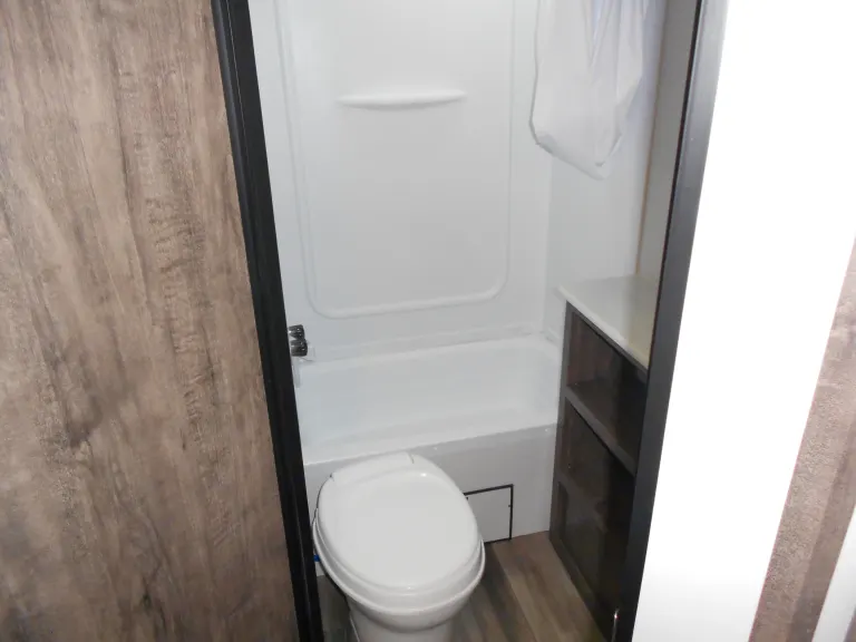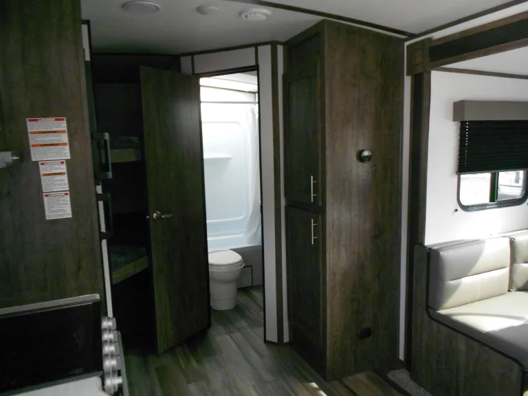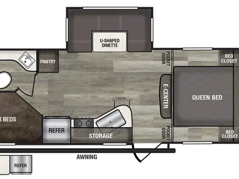 The camping lifestyle is better when you can invite more people along, and this model allows you to do just that! There are double-size bunks for the kids or your guests, and an RV queen bed in the front private bedroom. Additional guests can sleep on the U-shaped dinette slide when it's not being used for dining or game night. There is a full bath on board for your convenience and an interior kitchen the chef is sure to love. But they may love the outdoor kitchen even more!