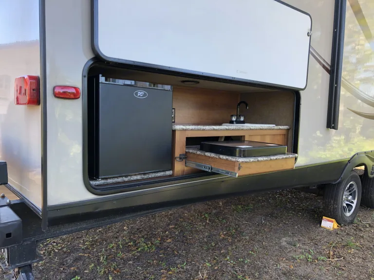 Completely loaded 8 person Rv with everything you could possibly need and more.We take pride and integrity in the cleanliness of our Rv's so your experience will be of the up most enjoyment. Spick and span, shiny and spotless is our motto!The inside kitchen is fully stocked with all the basics. The built in refrigerator and freezer are large for this size RV with 6 cubic feet of refrigerated storage space. We will ensure the refrigerator is cold upon delivery so you can immediately begin to use. There is a 3 burner gas stove and oven as well as a powerful microwave oven with splatter cover. The outdoor kitchen is equipped with an outdoor grill with a burner stove, hand wash sink, slide out counter for extra space and a mini refrigerator.